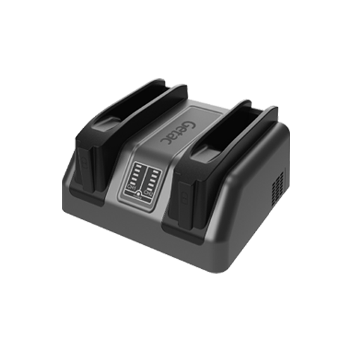 The Getac External Dual Bay Battery Charger (GCMCJ) is designed to enhance operational efficiency by allowing users to charge and store up to two batteries simultaneously. Ideal for environments with limited space and power outlets, this charger ensures that backup batteries are always ready for use, minimizing device downtime.
