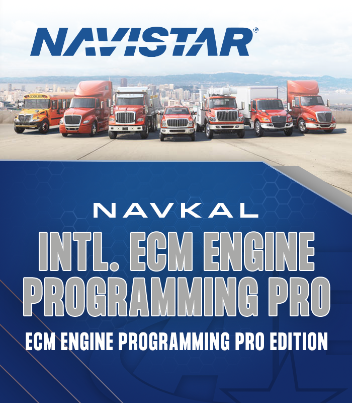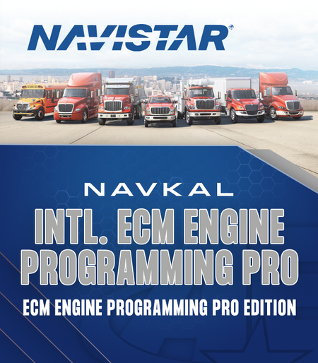 NavKal from International Truck & Engine offers ECM programming capabilities for engine ECMs through its standard edition. Users can update calibrations, access on-screen vehicle information including ECM software versions, read and clear DTCs, perform OEM-controlled parameter updates, engage in blank module programming, and program Pre-Maxxforce and Maxxforce Engines.